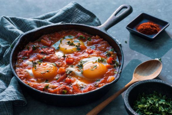 - Diese Form mit der roten Soße und den rohen Eiern jetzt in den Ofen geben und 7–10 Minuten backen lassen, bis die Eier fest werden.