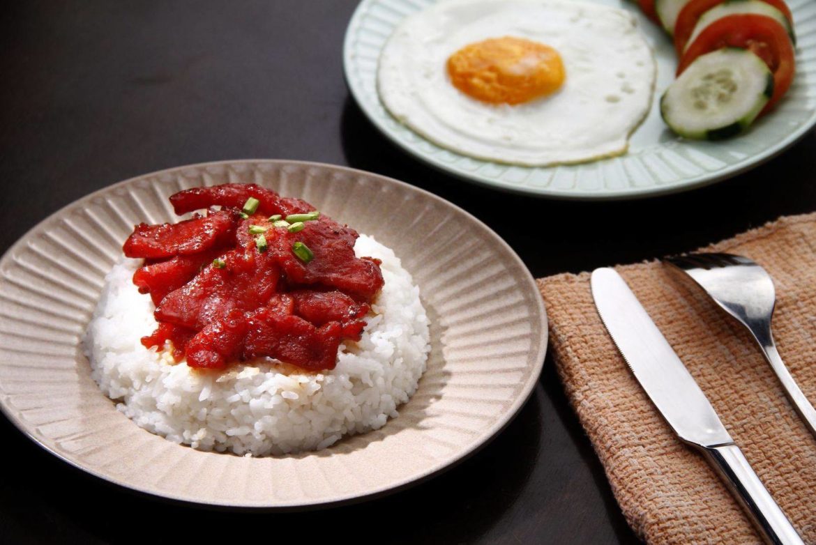 - Den gekochten Reis auf einen Teller legen und das gebratene Tocino und die Eier darauf anrichten.